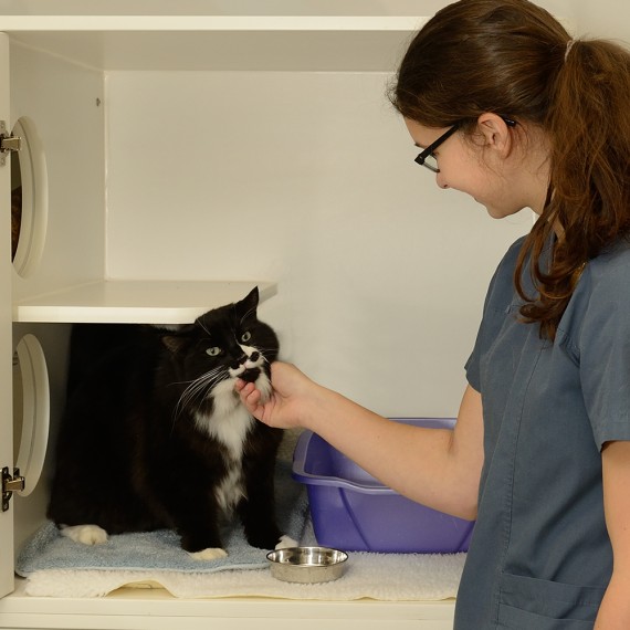 Les chats qui doivent rester à la Clinique Maguire pour plusieurs jours seront ravis de se retrouver dans leur magnifique condo spécialement conçu pour eux!